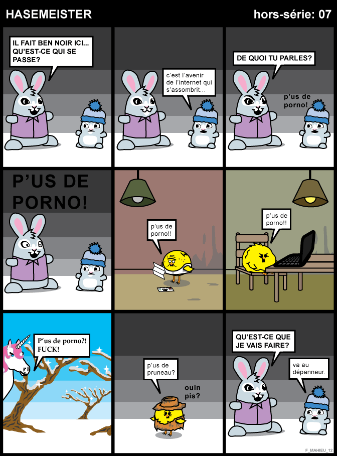 / 18 janvier 2012 / ------------------------------ / Si la nouvelle loi SOPA est accepté par le congrès américain, ce n'est pas seulement la fin de la porno sur le web mais aussi de la liberté d'expression et de la créativité. Fini les chats qui dansent sur du Justin Bieber. Si la fille de Winnipeg a pu rencontré son idôle en chantant une chanson de Lady Gaga, elle ne pourrait pas le faire avec cette nouvelle loi sans faire 5 ans de prison. C'est fou? Mais c'est ce qui s'en vient. Voyez la vidéo plus bas pour mieux comprendre mon charabia. Le site reviendra sous sa forme habituelle demain (jeudi). / ------------------------------ / fred mahieu / |